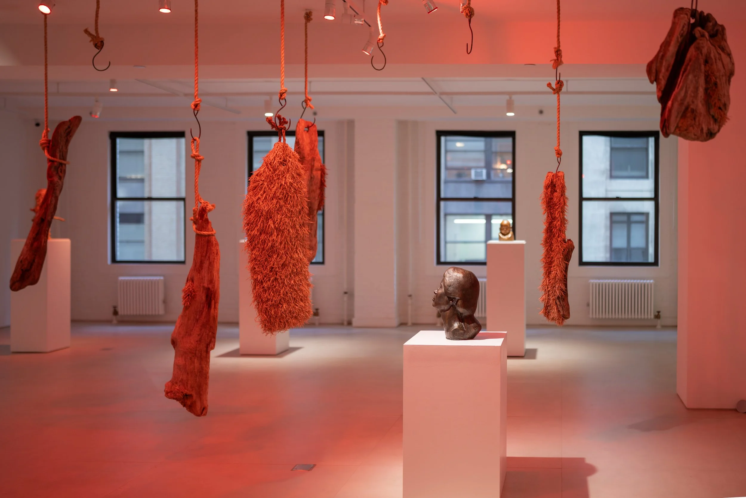 In the installation, each piece of driftwood is adorned with paper fur, forming “fur trees.” Under regular gallery lighting, these figures embody resilience and rebirth—trees that once stood tall have been transformed by the currents, yet continue to assert their presence, symbolizing adaptability and the enduring spirit of life. In contrast, when illuminated with red ambient light, the “fur trees” take on a haunting presence, evoking a sense of captivity or sacrifice. The red light, reminiscent of a slaughterhouse, highlights the harsh reality that some trees never reach their full potential, cut down before their time to serve human needs. The iron hooks from which they hang reinforce this tension, emphasizing the fragility of life in the face of external forces.